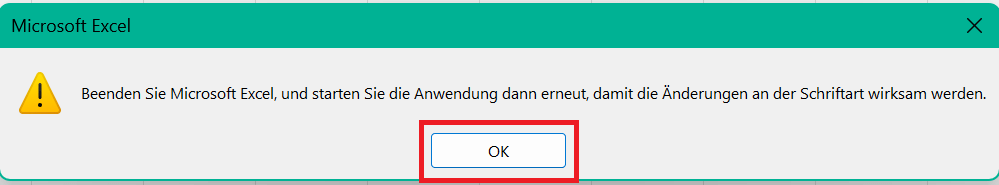 Schritt 7: Excel zeigt möglicherweise eine Nachricht an, die dich auffordert, das Programm neu zu starten, damit die Änderungen wirksam werden. Drücke "OK" und starte Excel neu, um sicherzustellen, dass die Schriftarteinstellungen übernommen werden.