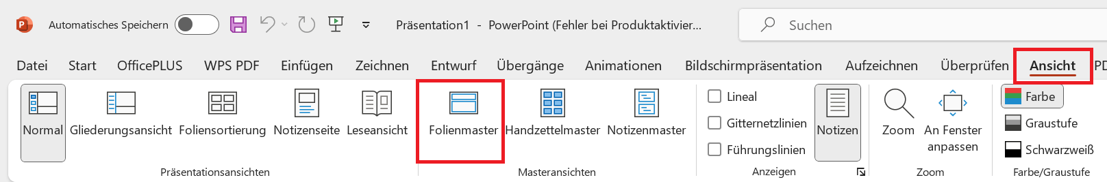 Schritt 2: Klicke auf die Registerkarte "Ansicht" oben im Fenster. Dann finde und wähle die Option "Folienmaster". Dies öffnet eine spezielle Ansicht, die die Designelemente deiner Folien steuert.