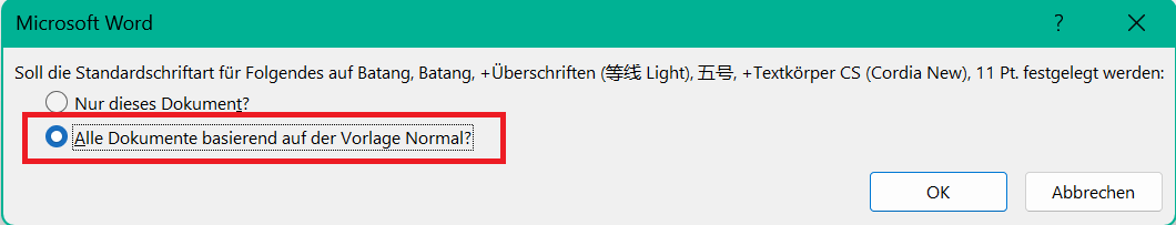 Schritt 5: Hier ist der wichtige Teil! Du wirst gefragt, wo du diese Änderung anwenden möchtest. Da du diese Schriftart für alles, was du zukünftig schreibst, verwenden möchtest, wähle „Alle Dokumente, die auf der Normalvorlage basieren“ und klicke auf „OK“.