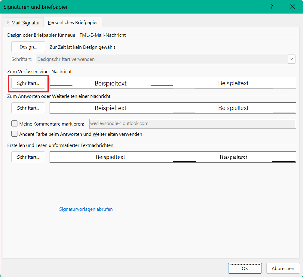 Schritt 5: Du kannst die Schriftart für neue E-Mails und Antworten separat ändern. Wähle zuerst die Option aus, die du anpassen möchtest (Neue E-Mail-Nachrichten oder Antworten oder Weiterleiten von Nachrichten).