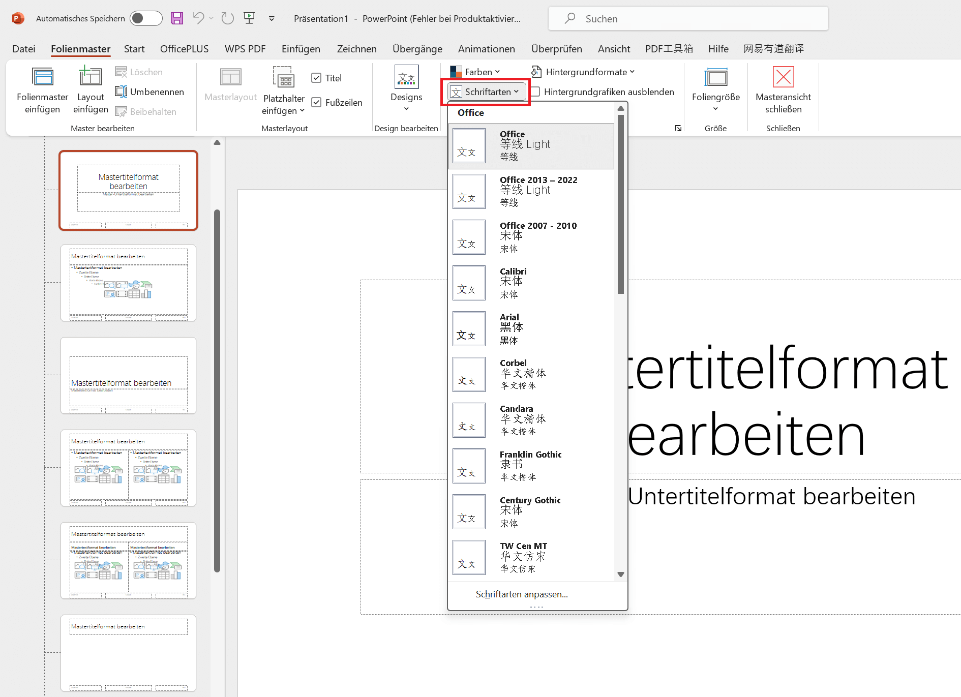 Schritt 3: In der Folienmasteransicht suche nach der Option "Schriftart" im Menüband. Klicke auf das Dropdown-Menü neben der Schriftartoption und wähle die Schriftart aus, die zur neuen Standard-Schriftart für alle deine Präsentationen werden soll.