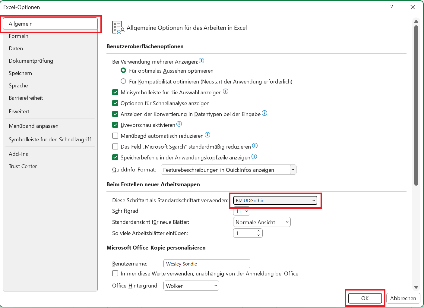 Schritt 5: Im Menü "Optionen" suchen wir den Abschnitt "Allgemein". Gehe zu diesem Tab und finde dann den Abschnitt mit dem Titel "Beim Erstellen neuer Arbeitsmappen". Schritt 6: Im Feld "Diese Schriftart als Standardschriftart verwenden" kannst du jede Schriftart auswählen, die du als deine bevorzugte Schriftart verwenden möchtest. Vergiss nicht, auf "OK" zu klicken, um deine Auswahl zu speichern.