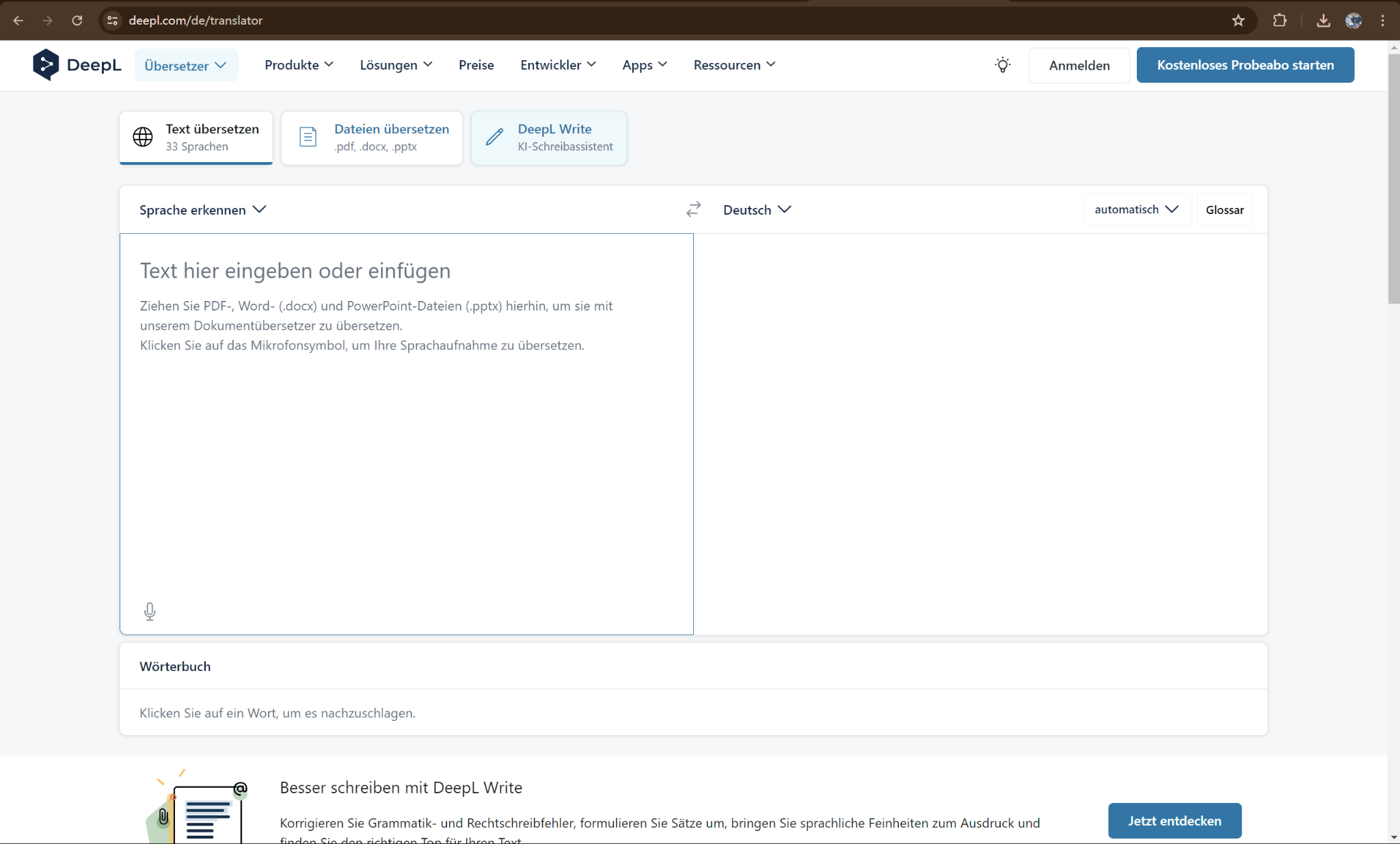 DeepL ist ein vielseitiges Werkzeug, das sowohl online als auch als Browser-Erweiterung verfügbar ist und mehrere Formate zur Auswahl bietet. Es ist bekannt für seine hohe Genauigkeit in der Übersetzung, was es zu einer ausgezeichneten Wahl für diejenigen macht, die professionelle Übersetzungen ihrer PDFs suchen. Wenn Sie beispielsweise ein detailliertes Forschungspapier auf Deutsch haben und es ins Englische übersetzen möchten, ohne Nuancen oder technische Begriffe zu verlieren, kann DeepL diese Aufgabe mit bemerkenswerter Präzision bewältigen.