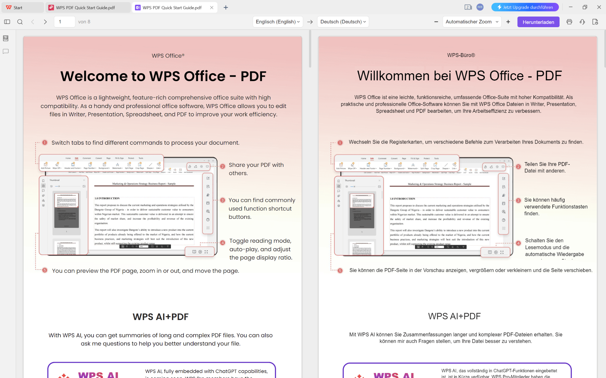 Benutzer können die übersetzte Version direkt im PDF lesen, wobei das Werkzeug den entsprechenden Quelltext zur einfachen Referenz hervorhebt. Das übersetzte oder zweisprachige Dokument kann heruntergeladen werden, was es zu einem vielseitigen Werkzeug für alle macht, die mit Dokumenten in mehreren Sprachen arbeiten müssen. Dieses umfassende Funktionsangebot macht WPS Office zu einer unverzichtbaren Ressource für sowohl private als auch berufliche Nutzung.