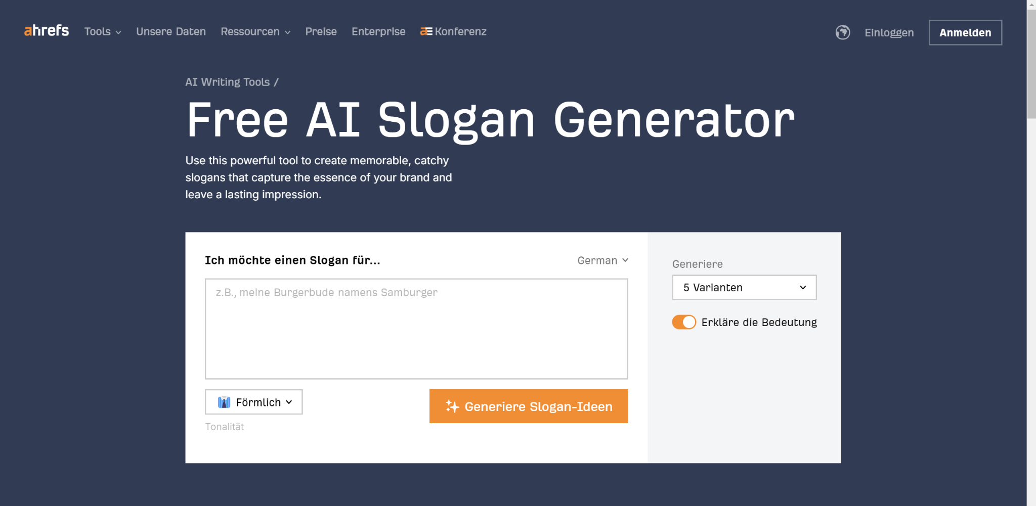 Der Slogan-Generator von Ahrefs ist ein hervorragendes Tool für Unternehmen und Marketer, die überzeugende und einprägsame Slogans für ihre Marken, Produkte oder Marketingkampagnen erstellen möchten. Er generiert eine Vielzahl von Slogan-Ideen basierend auf Schlüsselwörtern oder Markeneigenschaften und hilft dabei, die Essenz der Marke einzufangen und ihren einzigartigen Wertvorschlag zu kommunizieren.
