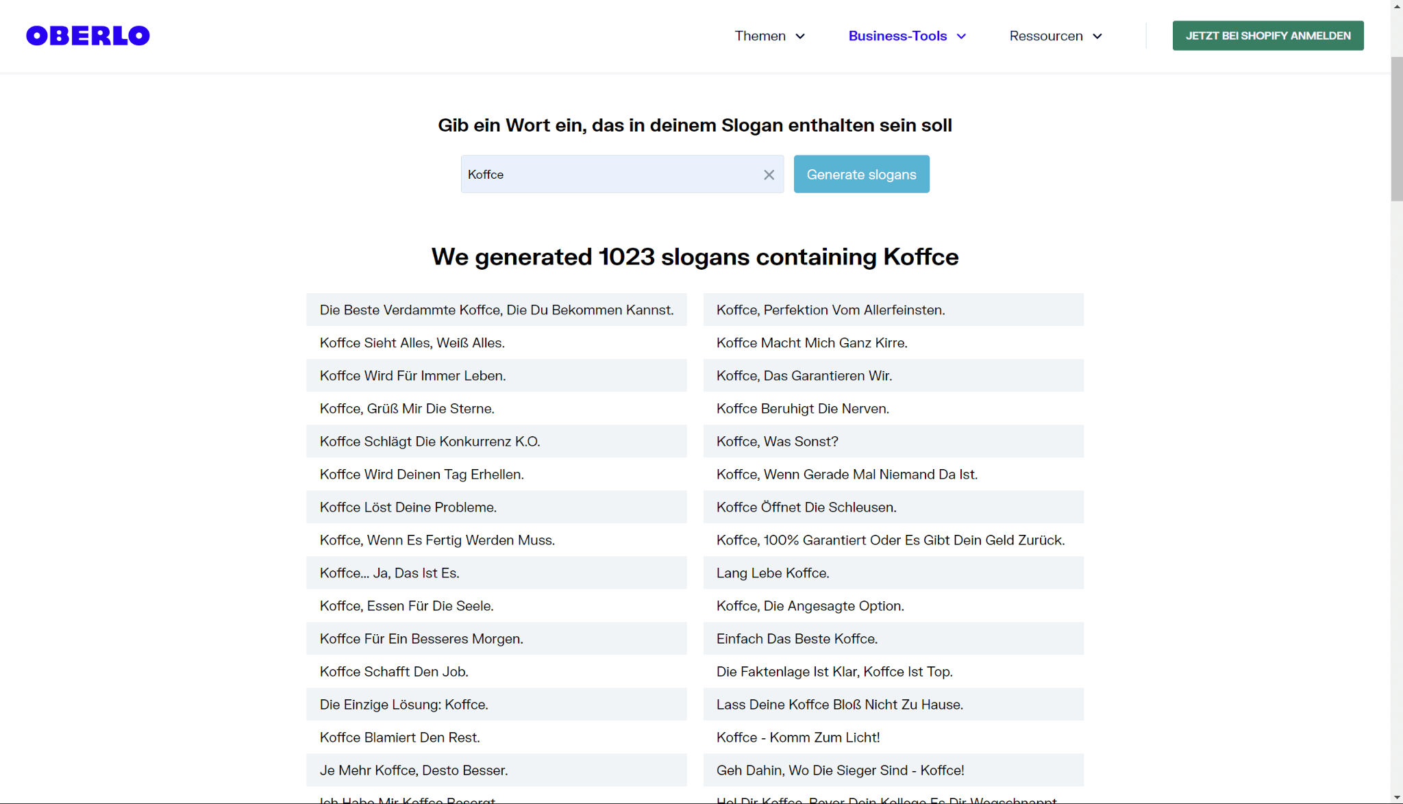 Wenn du ein Café eröffnest, das deutlich macht, dass du Kaffee verkaufst, erstellt der Oberlo Slogan-Generator entsprechend Slogans. Angenommen, du entscheidest dich, dein Café "Koffee" zu nennen. Das Tool generiert eine Vielzahl von Slogans, die auf dein Café zugeschnitten sind und dir helfen, den perfekten einprägsamen Spruch zu finden, um Kunden anzulocken.