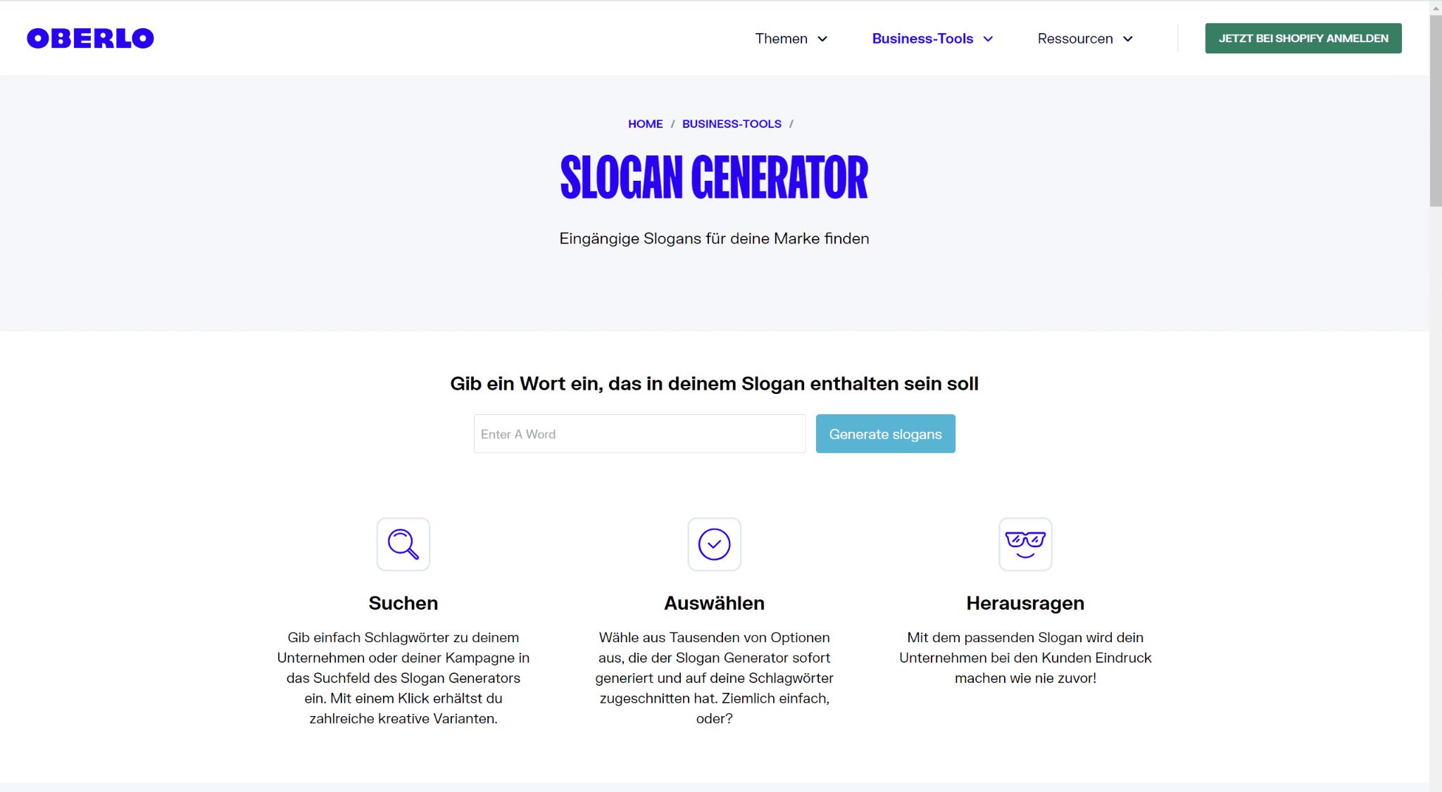 Es hängt völlig davon ab, was du von deinem Slogan erwartest – möchtest du, dass die Leute von der Genialität beeindruckt sind, oder möchtest du, dass die Leute sagen: „Wow, das ist clever“? Oberlo liefert dir Slogans basierend auf nur einem Wort als Eingabe. Es entschlüsselt, was dein Geschäft sein könnte, und gibt dir entsprechend über 1.000 Slogans.