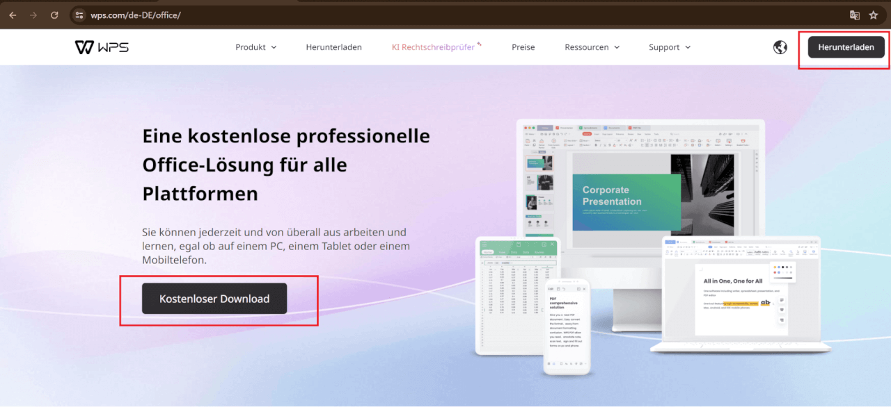 Schritt 1: Besuche die WPS Office-Website: https://www.wps.com/de-DE/office/