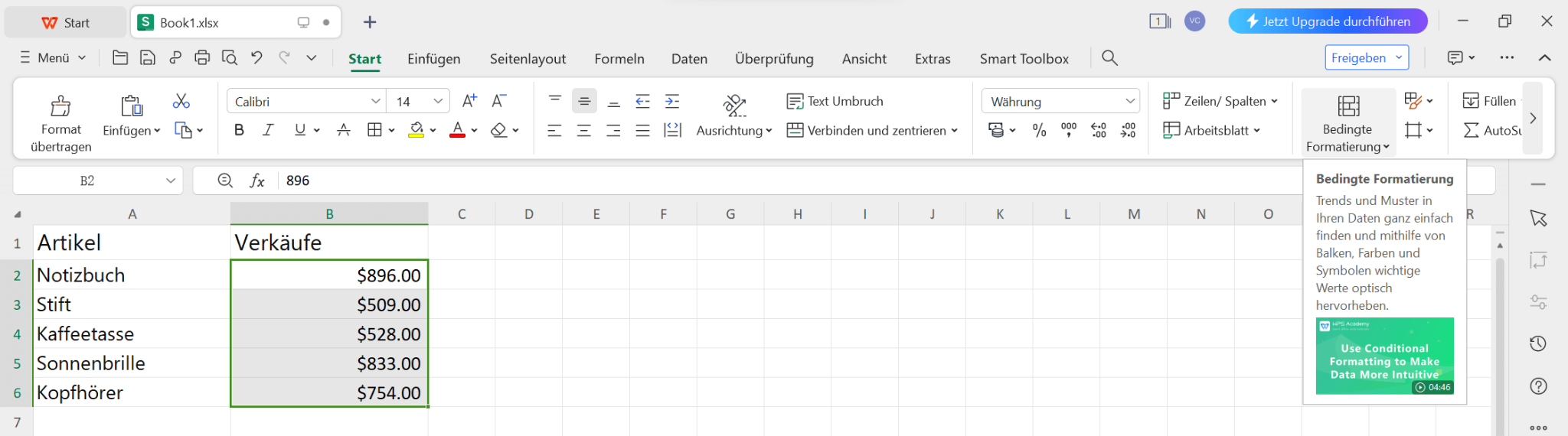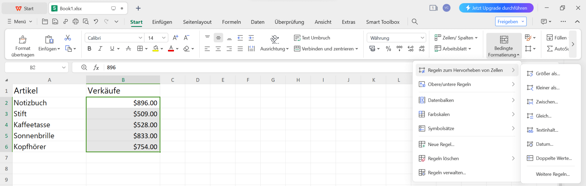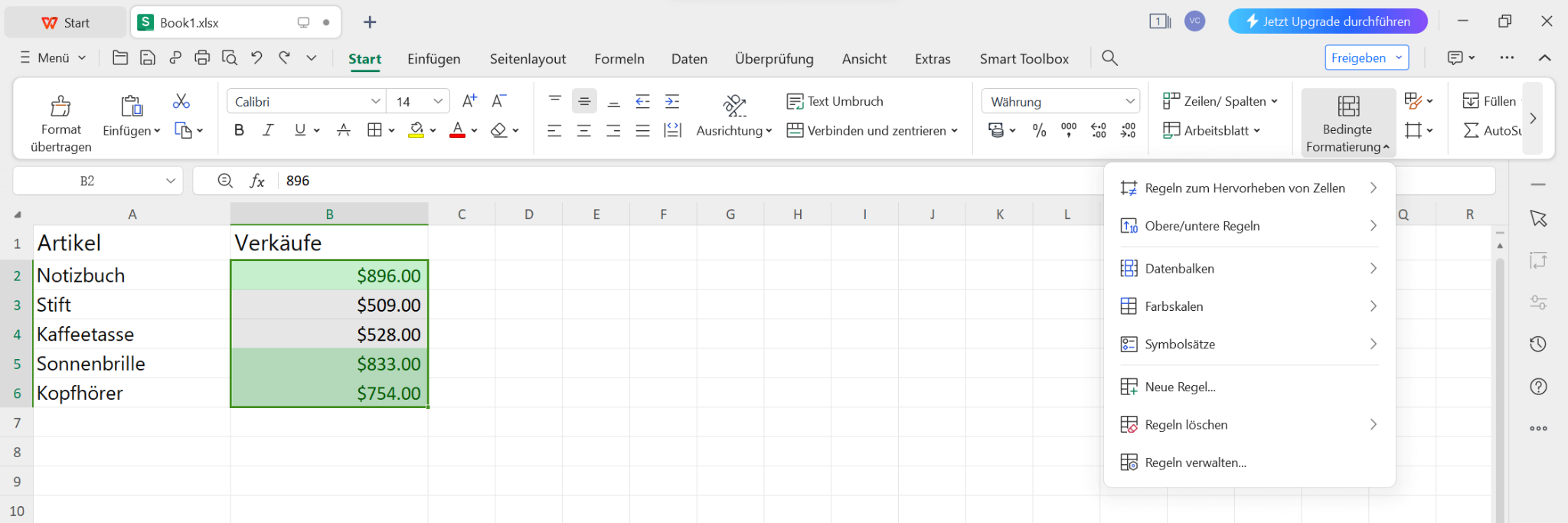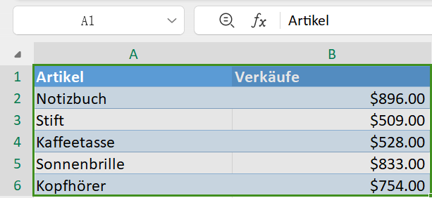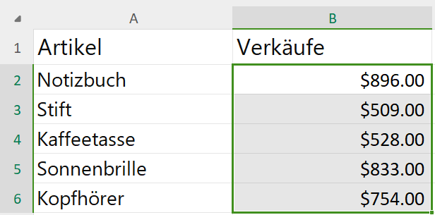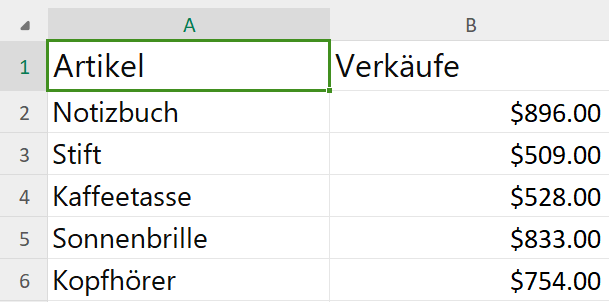 Um die bedingte Formatierung besser zu verstehen, werden wir einen Beispiel-Datensatz verwenden, der eine Liste von Artikeln und deren Verkäufen enthält. Wir werden die bedingte Formatierung auf die Spalte Verkäufe anwenden, um Zellen basierend auf verschiedenen Bedingungen hervorzuheben.