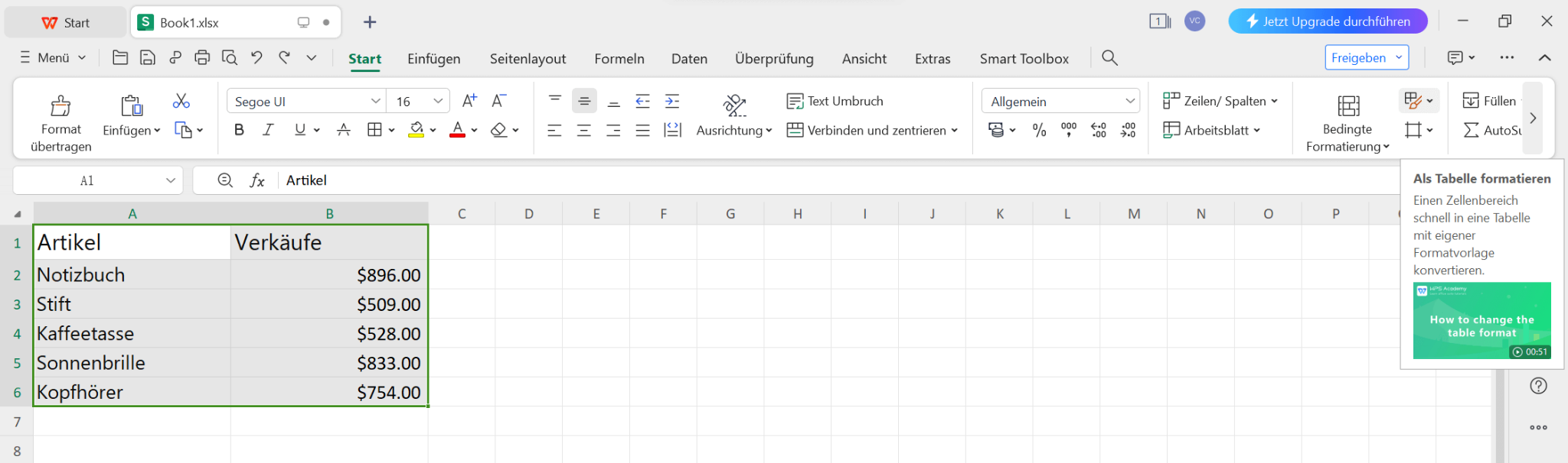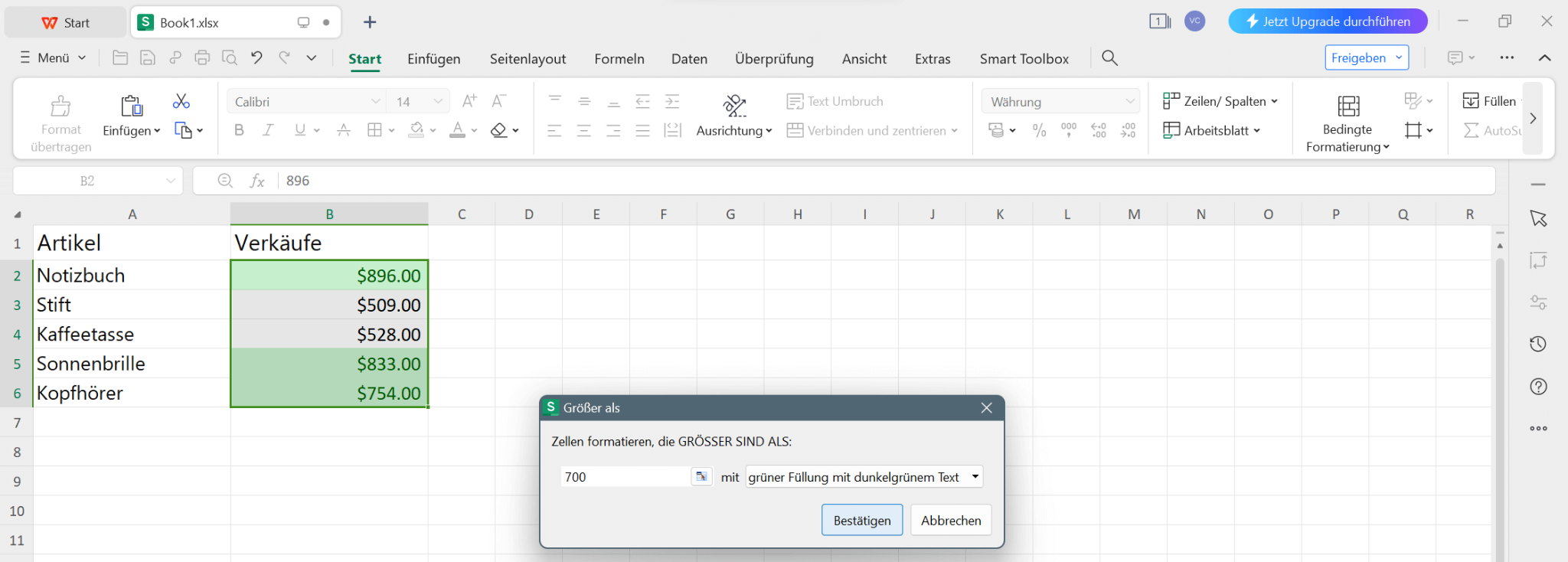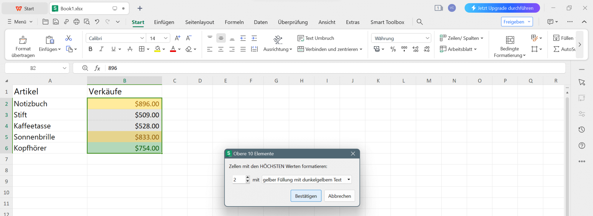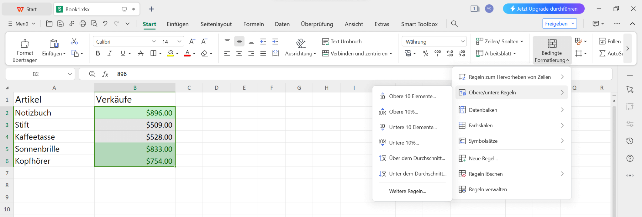 Um die bedingte Formatierung besser zu verstehen, werden wir einen Beispiel-Datensatz verwenden, der eine Liste von Artikeln und deren Verkäufen enthält. Wir werden die bedingte Formatierung auf die Spalte Verkäufe anwenden, um Zellen basierend auf verschiedenen Bedingungen hervorzuheben.