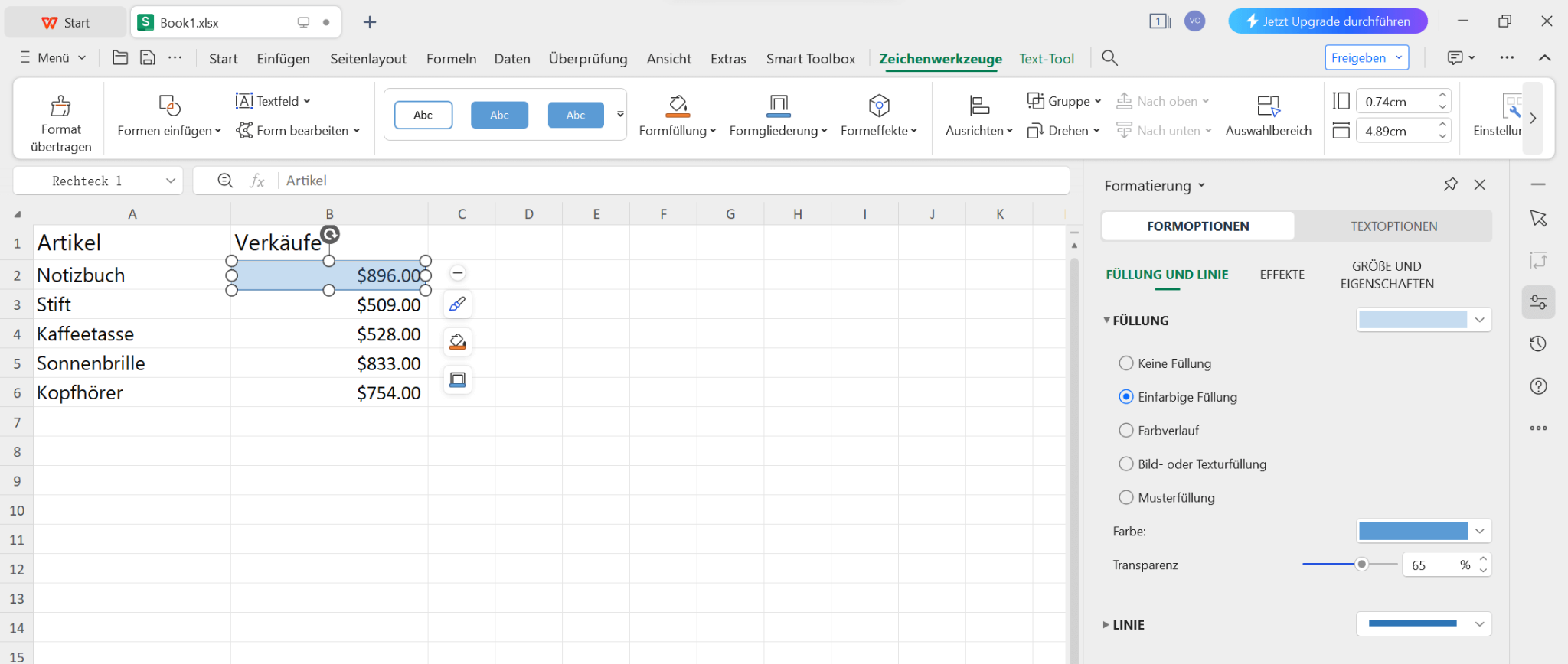 Schritt 6: Verwenden Sie hier den Schalter, um die Transparenz der Form anzupassen, damit der Text in der Zelle sichtbar bleibt.