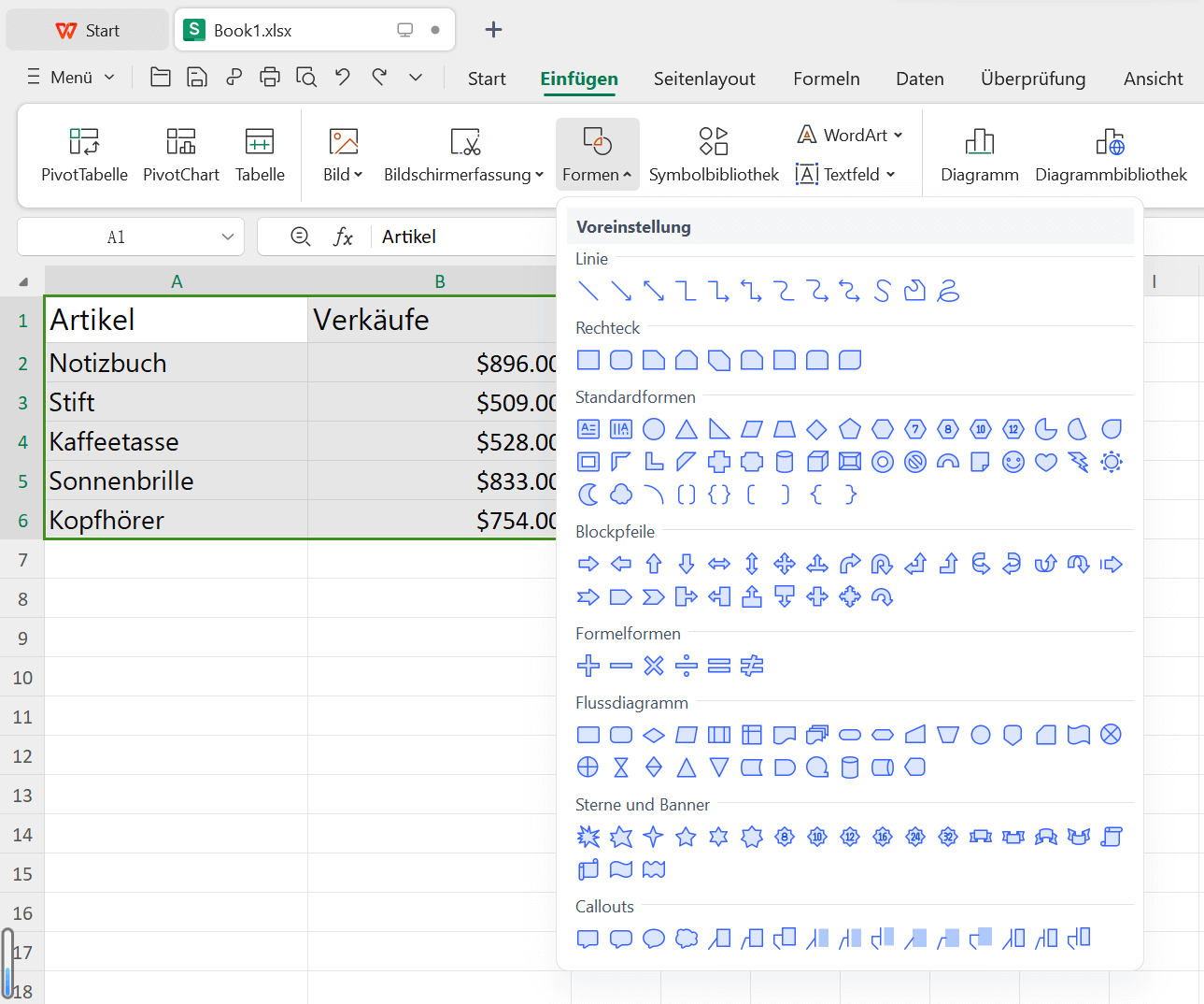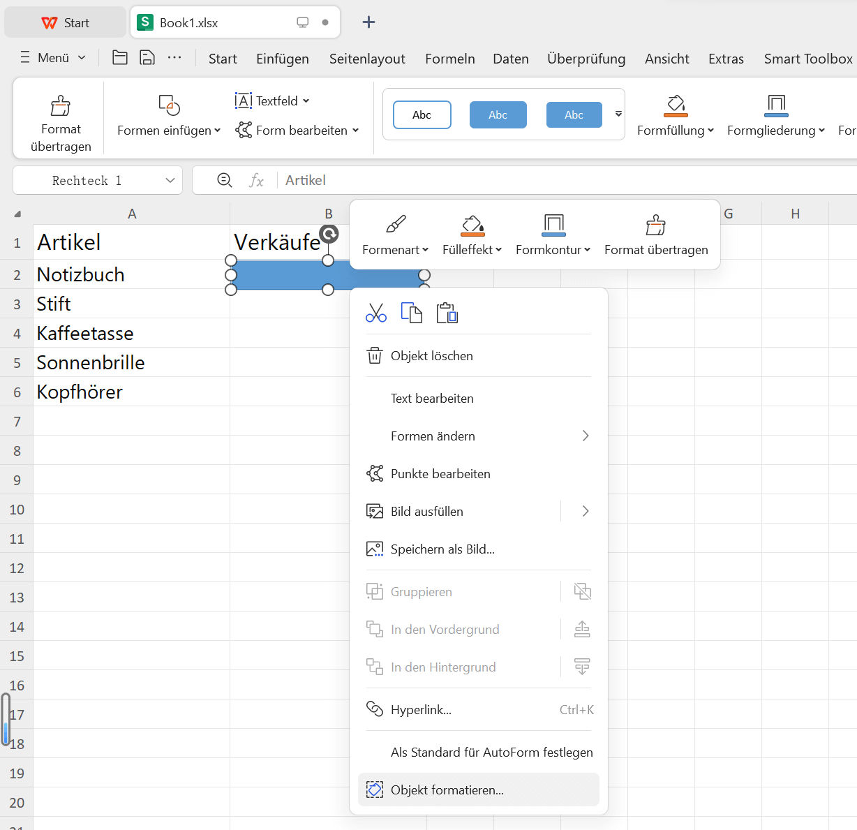 Die letzte Option in der Liste ist etwas unkonventionell, erledigt aber dennoch die Arbeit: eine Form einfügen, um in Excel mit WPS Office zu markieren. Schauen wir uns an, wie das möglich ist.