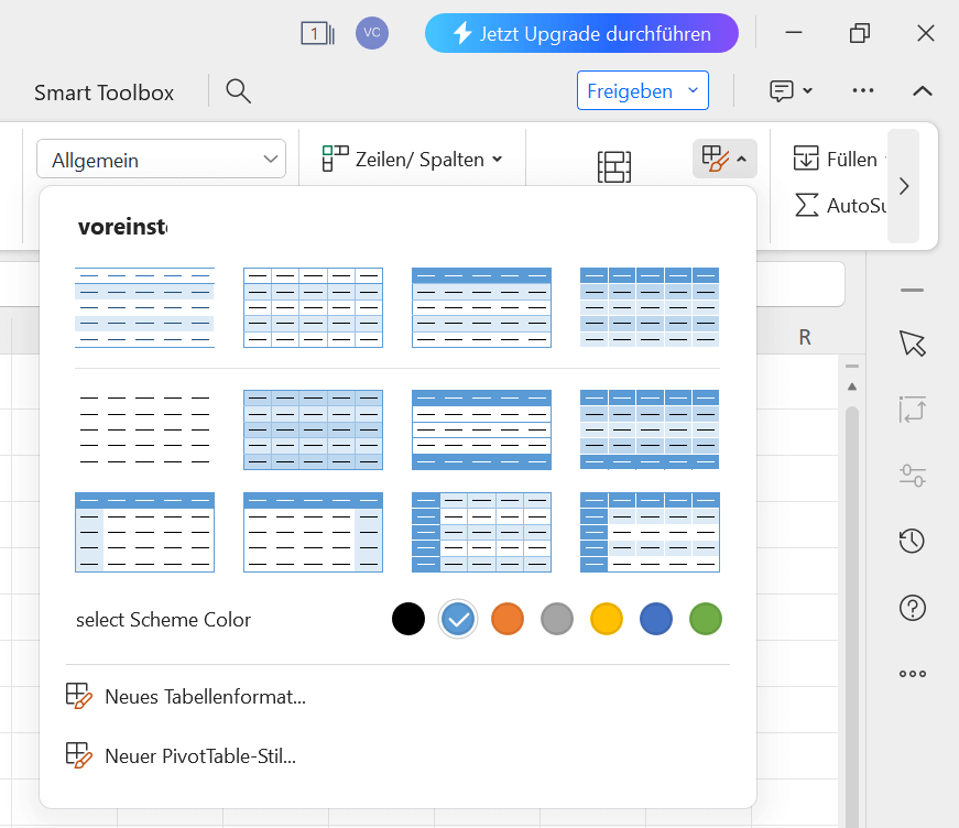 Schritt 3: Benutzer können aus einer Liste voreingestellter Tabellenstile wählen und auch ein Farbschema für ihre Tabelle auswählen.