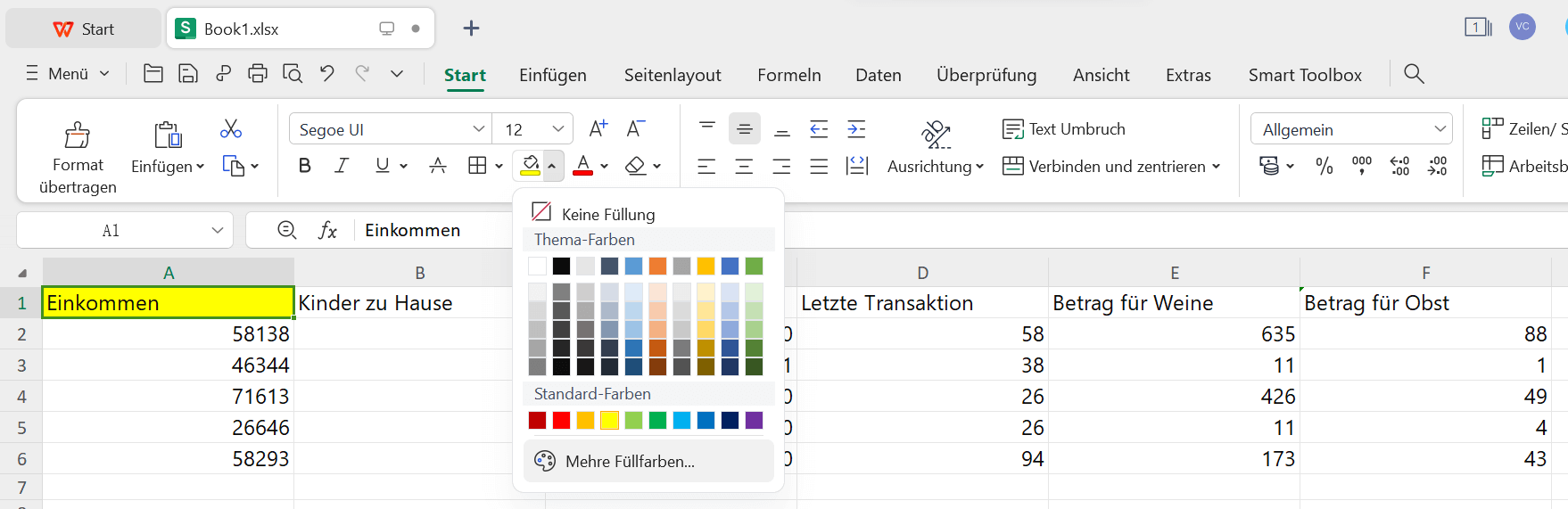 Der einfachste Weg, eine Zelle in Excel mit WPS Office zu markieren, ist die Verwendung des Tools "Füllfarbe". Dieses Tool füllt die Zelle einfach mit der Farbe Ihrer Wahl und schafft so eine visuelle Hervorhebung für Ihre Daten. Sehen wir uns an, wie man Zellen markiert und die Hervorhebungsfarbe in Excel mit WPS Office ändert:
