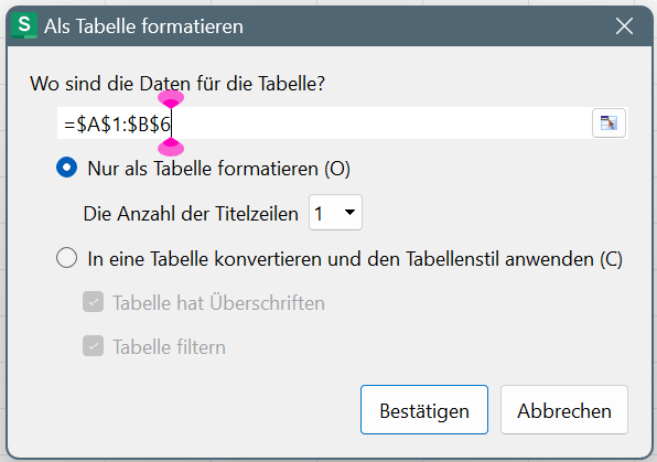 Hinweis: Standardmäßig geht das WPS Spreadsheet davon aus, dass Ihre Auswahl Überschriften enthält. Daher werden bei der Formatierung der Tabelle die ersten Zellen als Überschriften für Ihre Tabelle hervorgehoben.