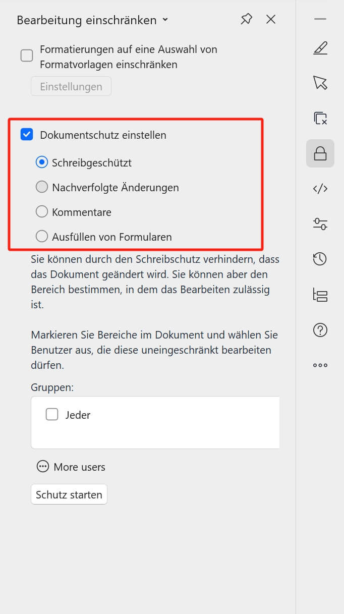 Schutz festlegen: Diese Option bietet zusätzliche Möglichkeiten, Ihr Dokument vor unnötigen Änderungen zu schützen. Sie haben folgende Auswahlmöglichkeiten: