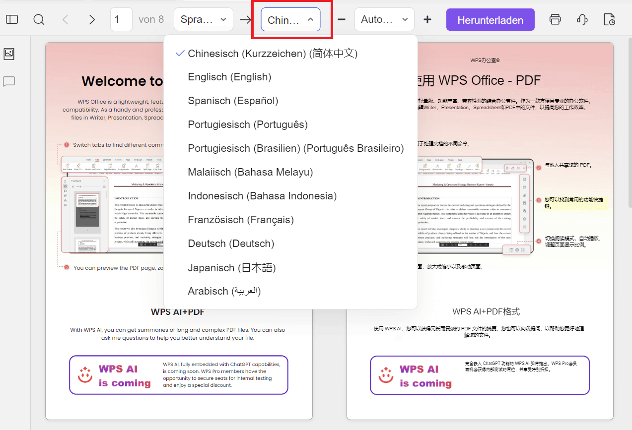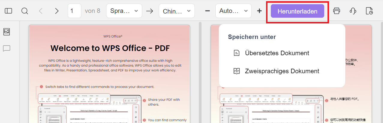 Schritt 7: Um die übersetzte Version zu speichern, klicken Sie auf die Schaltfläche „Download“. WPS PDF bietet die Möglichkeit, entweder nur die übersetzte Kopie oder eine zweisprachige Version herunterzuladen.