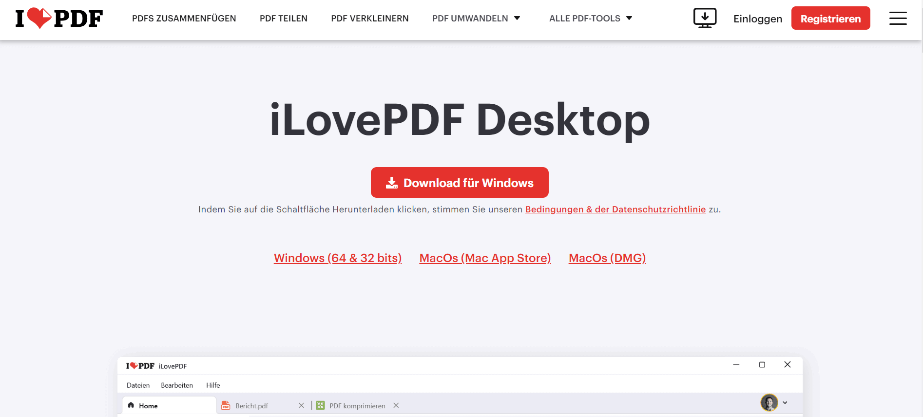 Laden Sie die iLovePDF Desktop-App für Mac oder Windows von der offiziellen Website (https://www.ilovepdf.com/de/desktop) herunter und installieren Sie sie..