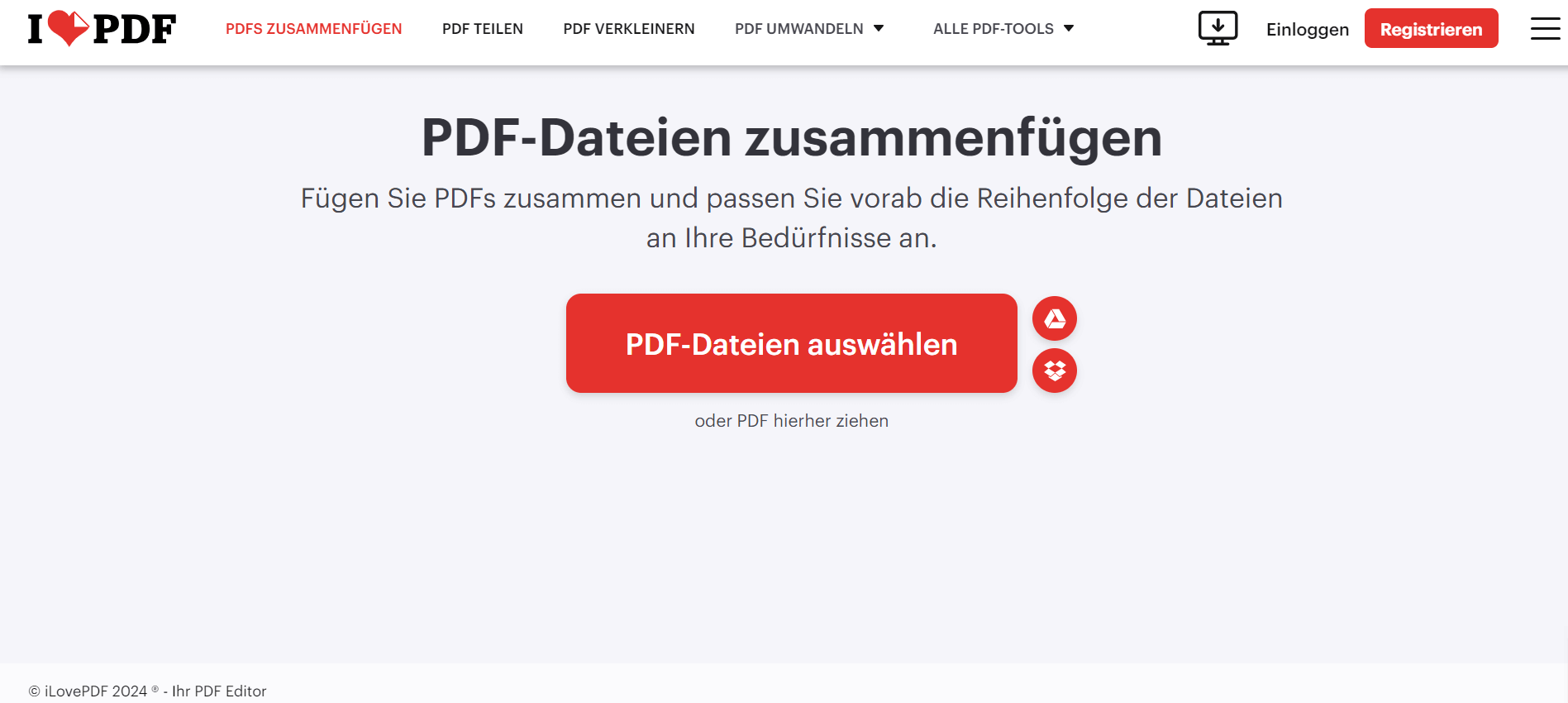 Um PDFs mit iLovePDF Online zusammenzuführen, befolgen Sie diese Schritte: