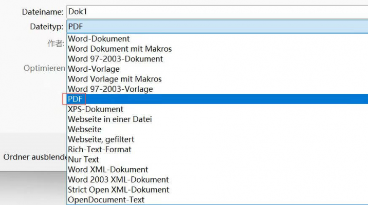 Schritt 4: Wähle "PDF" aus der Liste der Dateiformate und klicke auf "Speichern".